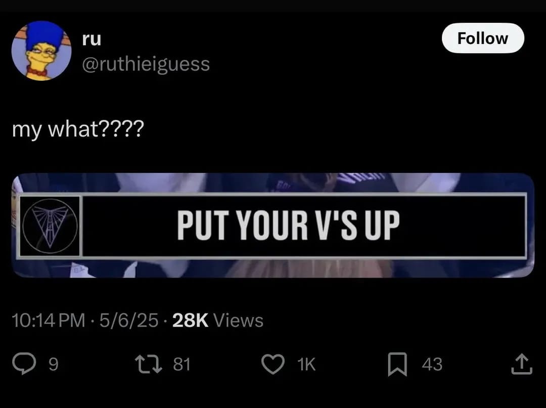 During the games, sapphic Valkyries fans immediately latched on to the in-game PA announcement to "put their Vs up" by spreading their index and middle fingers and raising them in the air. “Welcome to the world Sappho envisioned,” wrote one commenter on espnW’s TikTok about it. Other teams may do similar gestures — the Phoenix Mercury encourage their fans to cross their arms in an "X" to represent the "X-factor" they bring to the stands — but none can be read as innuendo. The team has declined to answer questions about the potential double-meaning of the “V,” but that hasn’t stopped queer fans from feeling welcomed by it.