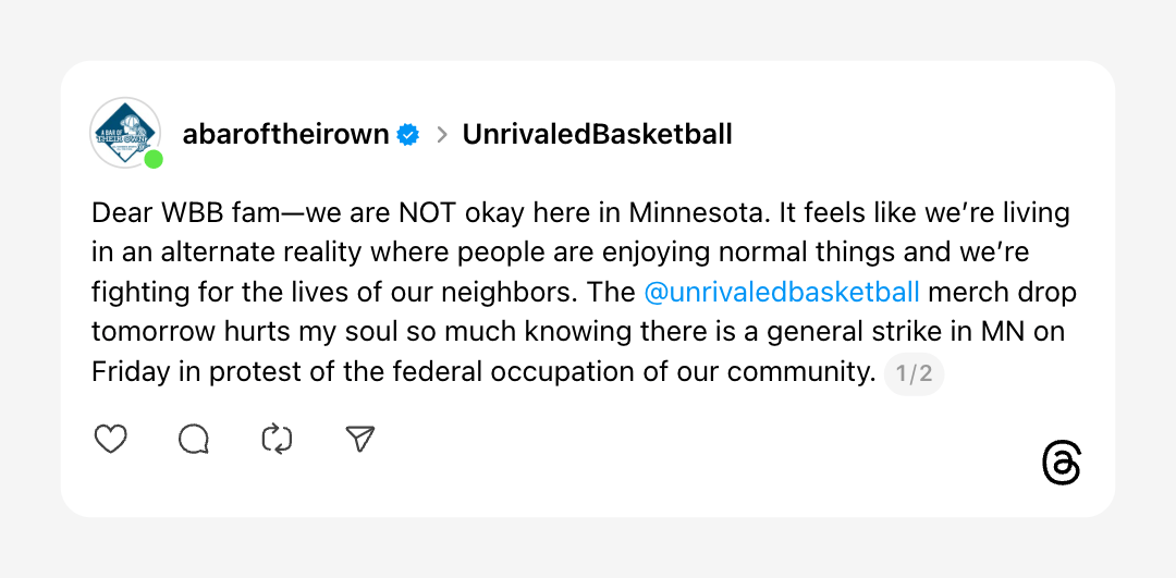On Threads, Hiscock used her ABOTO account to ask Unrivaled to postpone their merch drop by a day so as not to interfere with the general strike to support Minnesota (she did not get a response from the league, nor did OOYL when requesting comment. However, several Unrivaled players, including Breanna Stewart and Natasha Cloud have expressed support for the ongoing protests).