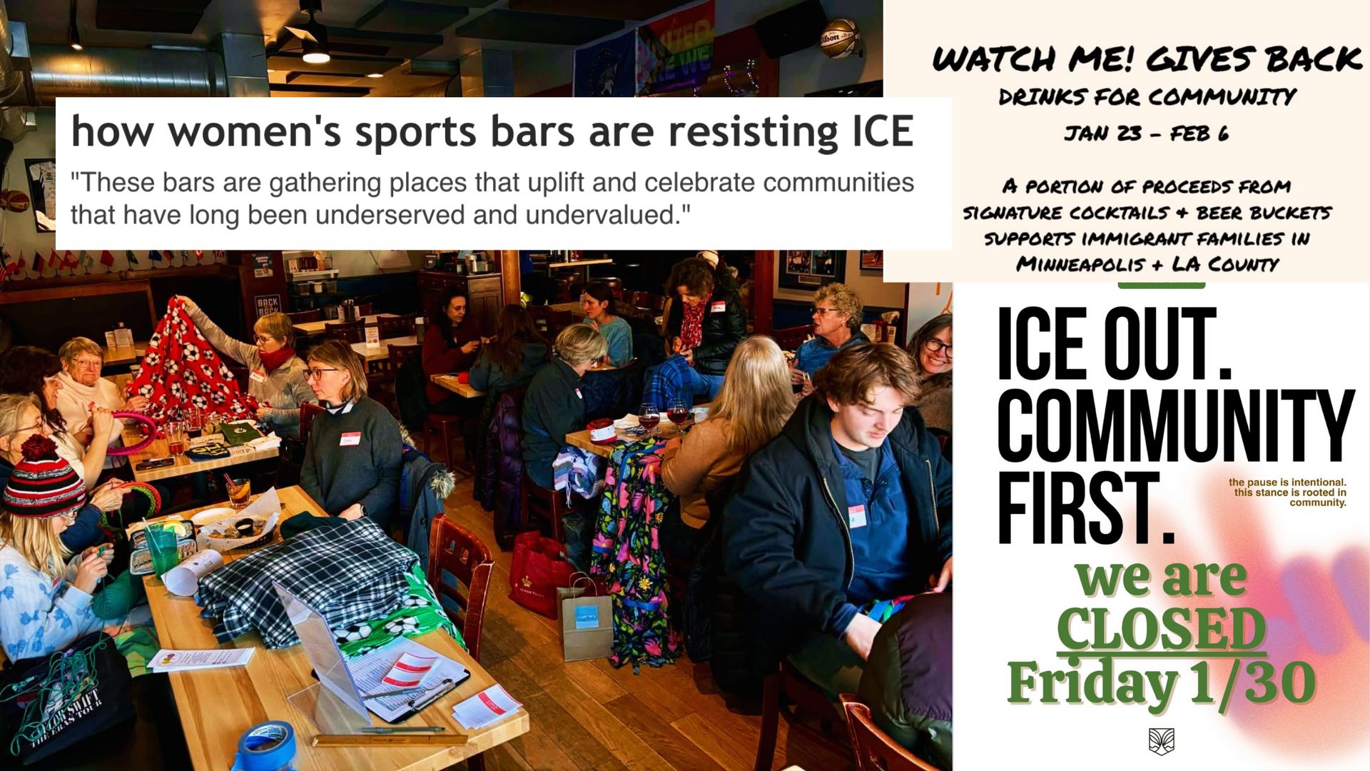 ABOTO isn’t the only women’s sports bar who is stepping in to rally their community. Watch Me! Sports Bar in Long Beach, California, is donating portion of proceeds from all beer buckets and signature drinks through Feb 6 to LA County and Minneapolis legal and mutual aid organizations. "What I have seen since the election is that the tone has changed,” Jax Diener, owner of Watch Me! Sports Bar, tells Out of Your League. “Women's sports bars have become more overtly political and the stakes are too high to sit these causes out. What began as a space to watch women's sports has grown into a place to advance women's issues and empower all people."