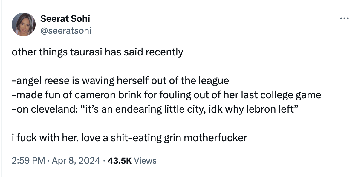 I have an op-ed up at CNN today [ed. note: April 2024] about why women’s sports should have more shit talking, not less. I pitched this as “let women be haters” and I had a lot of fun recounting the best WNBA rivalries in recent memory, specifically Kahleah Copper vs. Sophie Cunningham (the shirts!) and the Sky trolling Diana Taurasi with the broken locker room door.