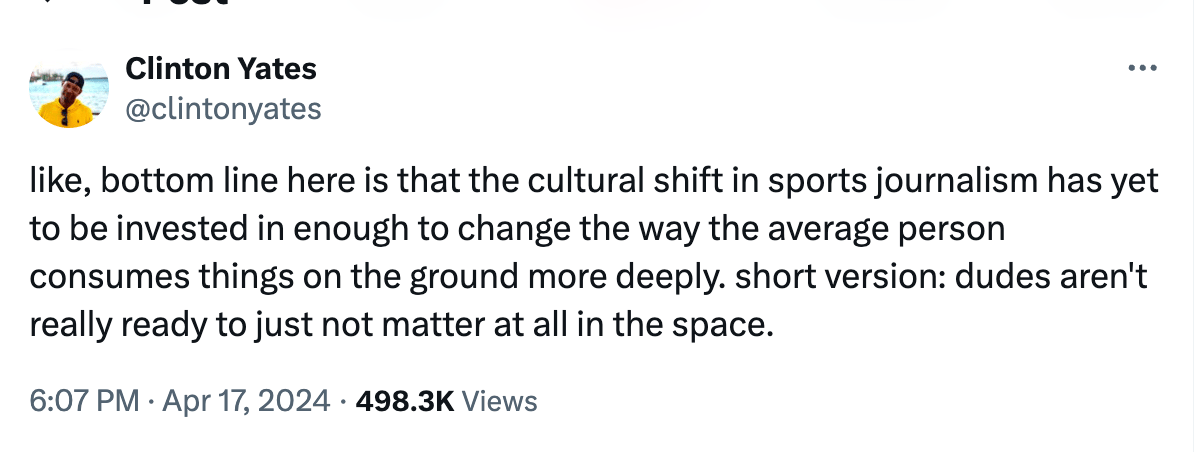 If you were lucky enough to avoid having to see the very cringy exchange between Caitlin Clark and Indy Star columnist Gregg Doyel, consider yourself lucky. It went viral yesterday and sparked outrage for being creepy. He wrote an “apology” column that was very “aw, shucks” and tbh I wouldn’t blame the Fever if they revoked his media credentials. I’ll have more to say on this next week when I publish an interview with Dr. Nef Walker, who researches organizational exclusion and culture in sport. But for now, I appreciated this take from Clinton Yates: