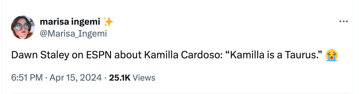 You know who else is a Taurus? Dawn Staley. “I feel like all centers should be earth signs,” Marisa continued, noting that Cameron Brink is a Capricorn (I did more of the astrology of Brink and other March Madness stars here).