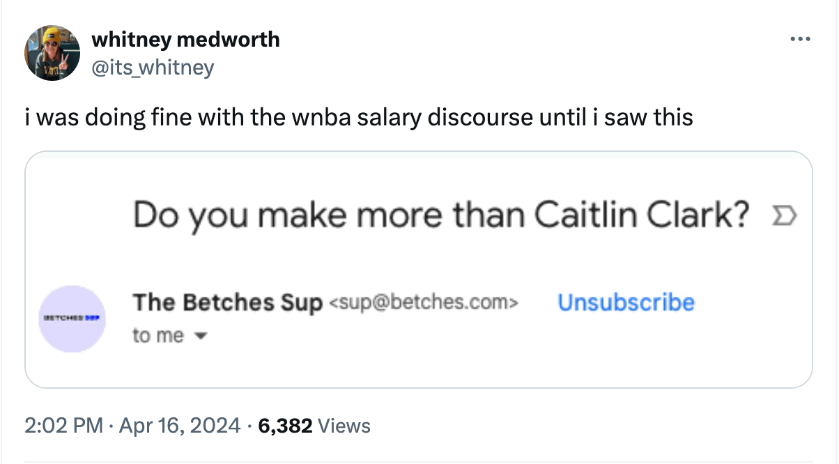 But back to Clark. The framing of her as a near-poverty level athlete is laughable. If you were one of the 2.45 million people who watched the draft Monday night, you would have seen her in three commercials in the span of like two minutes. And less than a day after the “Caitlin Clark is making poverty wages” conversation reached its crescendo came this announcement: