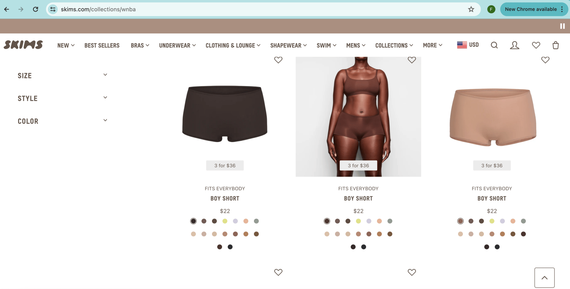 When you go to the landing page for the Skims WNBA collection, you can see that this “Fits Everybody” line of underwear comes in other cuts, including boyshorts. And the products are modeled on different body shapes on the website itself. So why don’t the promotional images represent those options?