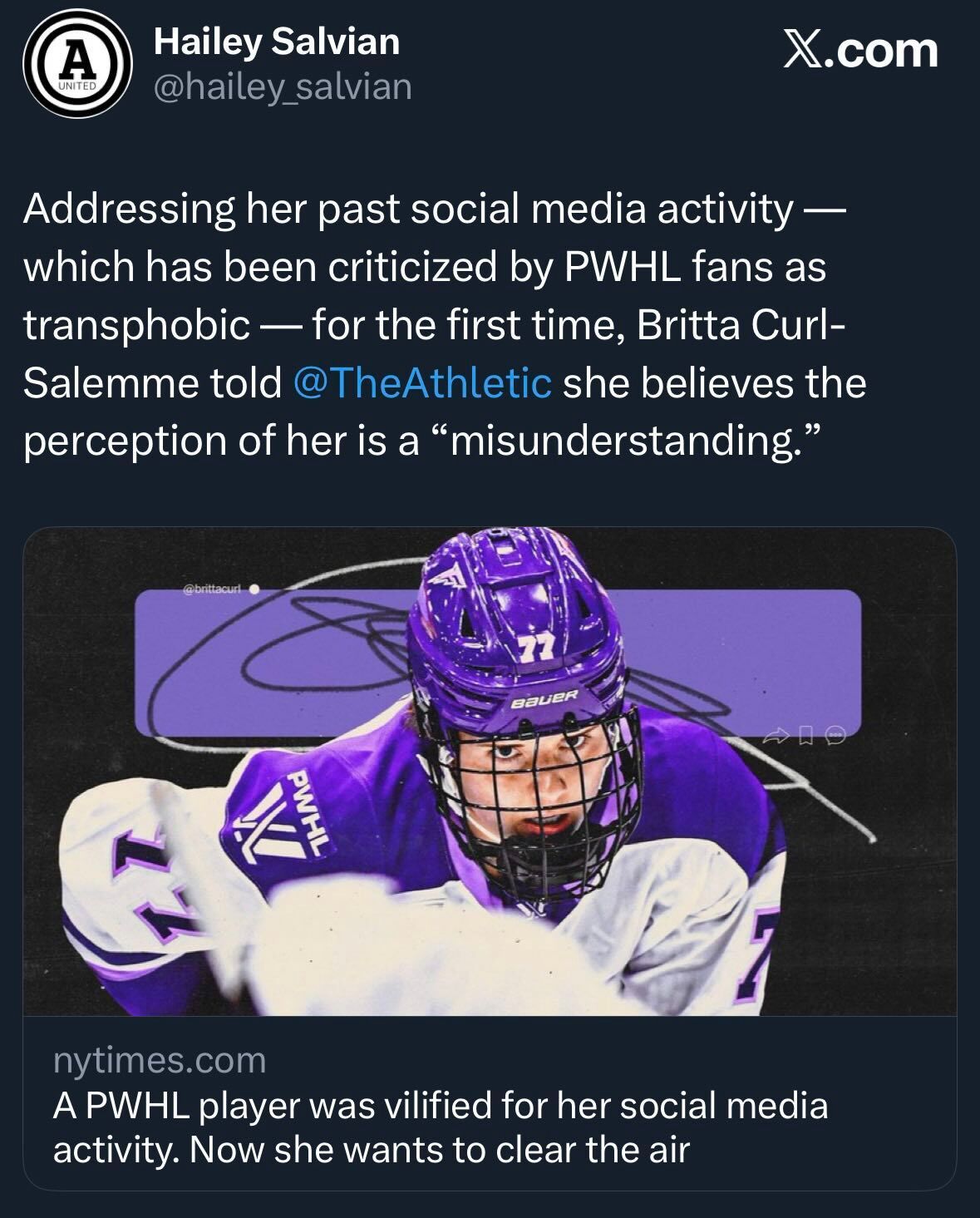 This past week, The Athletic ran a story claiming to give Curl-Salemme an opportunity to “clear the air” about the “misunderstanding” that has led to her continued dislike among the PWHL fandom. The article, penned by Hailey Salvian, spends over 2600 words trying to rehabilitate Curl-Salemme’s image (for the record, Salvian is a wonderful journalist and I love and respect the majority of her work).