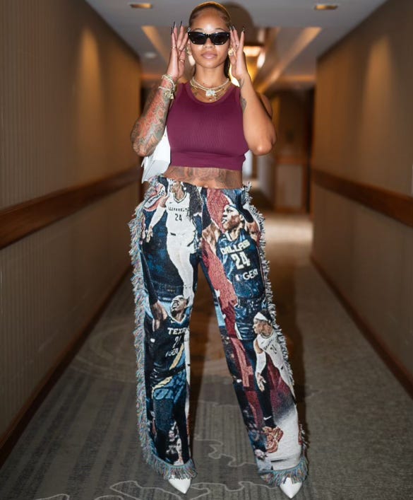 Speaking of WAG fashion and WNBA All-Star Weekend, can we discuss these custom pants worn by Arike Ogunbowlae’s fiance, Lala Ronay??? What a perfect outfit to wear on the night that your partner sets a WNBA ASG record for points and wins her second ASG MVP (the custom nails also deserve a shout).
