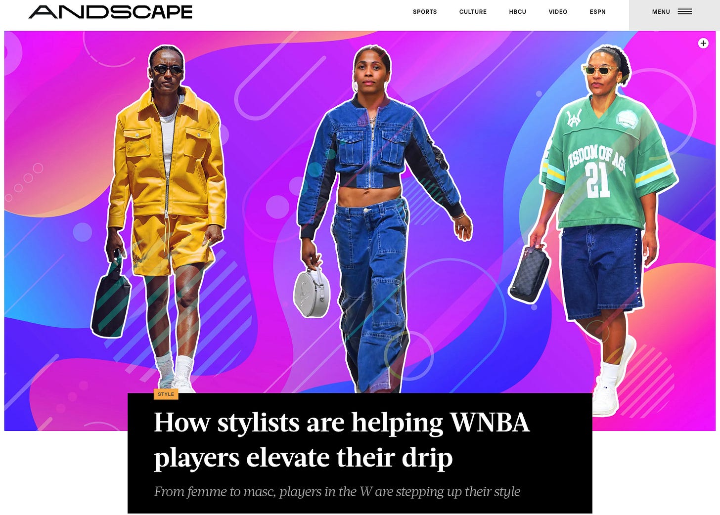 “Sometimes when we look at female athletes we assume fashionable means ‘feminine’ and a lot of the more masculine-presenting WNBA players really do have style about them,” said Amadi Brooks of Amadi B Styling, who works with Sydney Colson and A’ja Wilson of the Las Vegas Aces. “That’s the beautiful thing about the W — it’s such a wide range.”