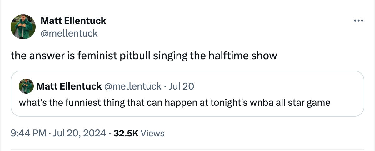 Hi, friends. Thank you so much for being here. I know it’s been quieter than usual around these parts; it’s WNBA season & the Olympics so my plate is full with paying freelance work (some of which you’ll see below) & I’m also preparing to move on August 1st. Thanks for sticking with me. Coming soon: Olympics content! More “In the Field” interviews! All of it gay! Today: lots and lots of links and memes, so strap in! It’s mostly basketball related this time, but don’t worry, I’ve got the rest of you for next time.